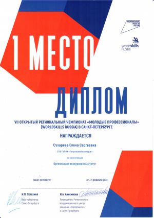Диплом за 1 место WSR Организация экскурсионных услуг
