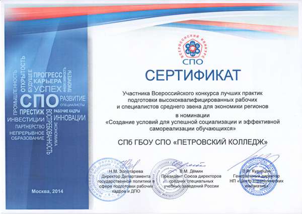 Сертификат за конкурс лучших практик подготовки рабочих и спец-тов для экономики регионов