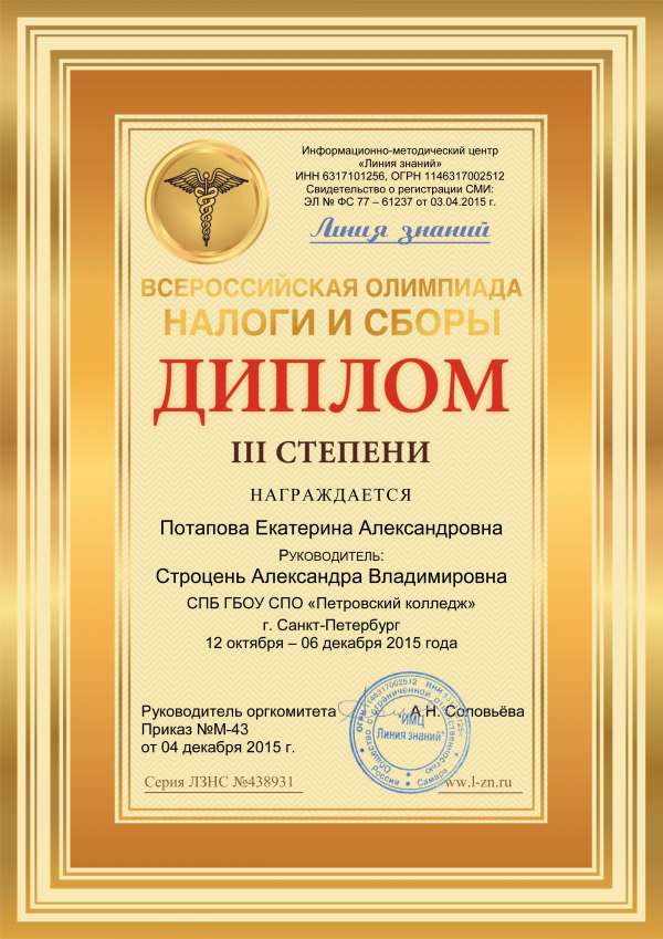 Дипломы III степени студентов за участие во Всероссийской олимпиаде Налоги и сборы