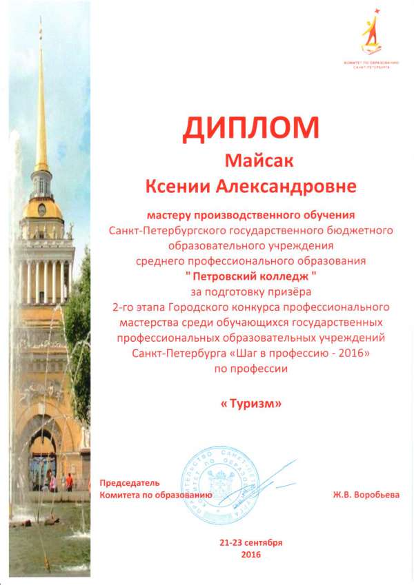 Диплом за 3 место в финале X Национального чемпионата «Молодые профессионалы», «Туроператорская деятельность»