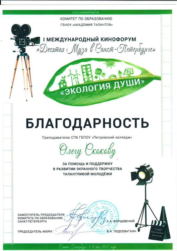 Благодарность за активное участие в социальном партнерстве по подготовке кадров для экономики Санкт-Петербурга