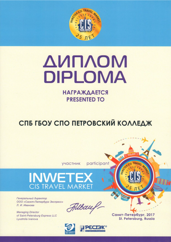 Диплом СПб ГБОУ СПО "Петровский колледж" за педоставленную экспозицию на VII Международном конгрессе-выставке "Global Education - Образование без границ - 2013"