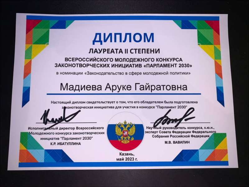 3 июня 2023 года прошла церемония награждения победителей во Всероссийском молодежном конкурсе законотворческих инициатив «Парламент 2030» в г. Казань, Республика Татарстан в Казанской городской думе.