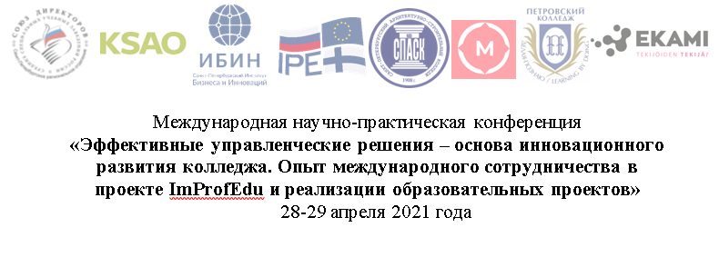 28-29 апреля 2021 г. на базе СПб ГБПОУ «Петровский колледж» прошла Международная научно-практическая конференция «Эффективные управленческие решения – основа инновационного развития колледжа. Опыт международного сотрудничества в проекте ImProfEdu и реализации образовательных проектов». Конференция прошла под эгидой Региональной общественной организации «Совет директоров организаций среднего профессионального образования Санкт-Петербурга», финансирование конференции осуществлялось из средств Европейского союза, Российской Федерации и Финляндской Республики.