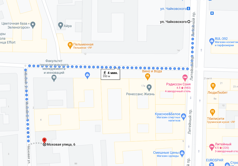 Путь к корпусу № 6 (ул. Моховая, д. 6, лит. А) от остановки общественного транспорта «ул. Чайковского»: